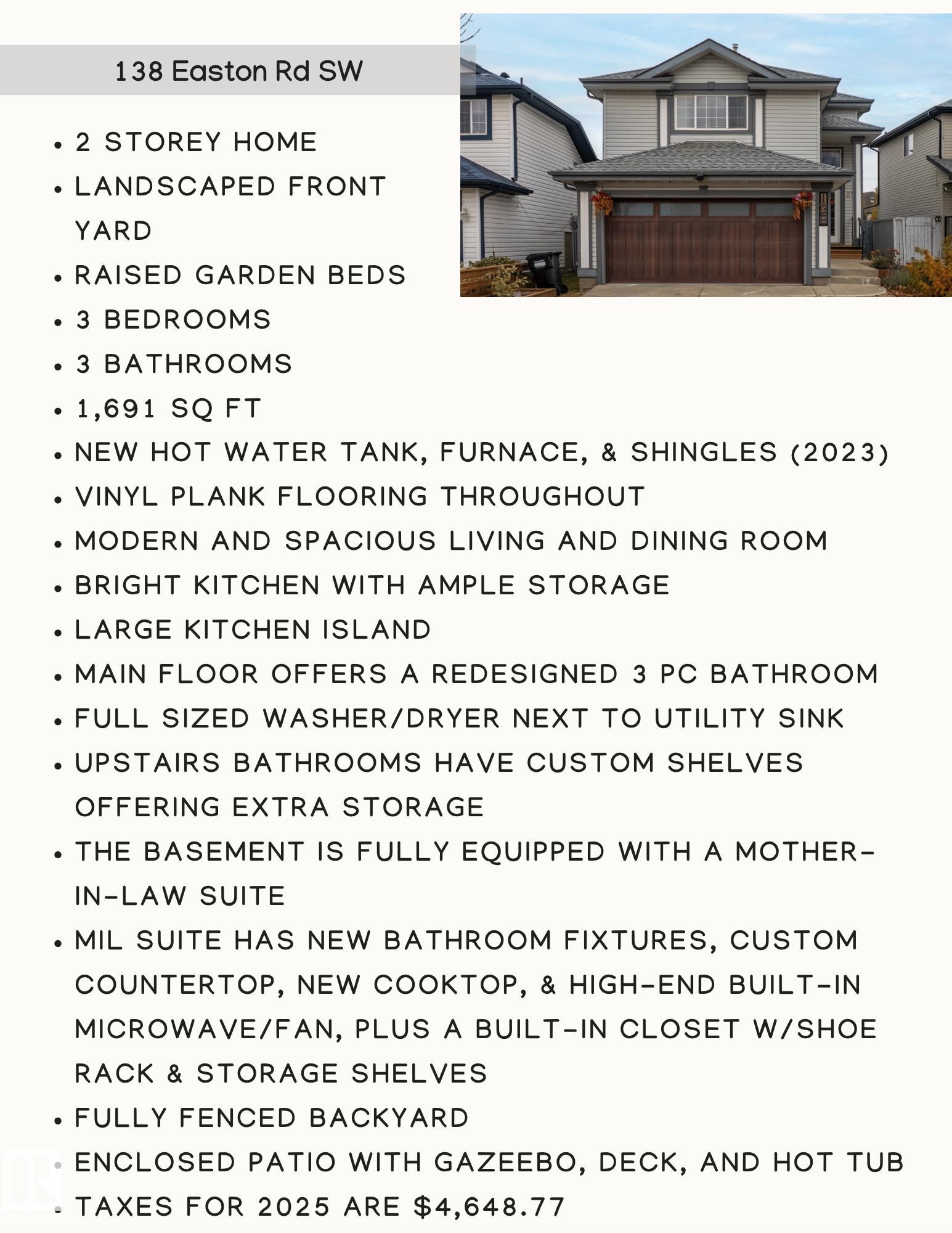 Thoughtfully updated 3-bed, 3-bath home with fully finished bsmt & dbl att garage. Featuring 1,691 sq ft of comfortable living space, this property blends modern convenience with family-friendly design. Major upgrades incl new HWT, furnace, & shingles (all 2023), plus fully drywalled/insulated garage w/upgraded door. Main flr redesigned 3-pc bath incl full-sized front-load washer/dryer & utility sink for added convenience. Vinyl plank flooring throughout, connecting spacious living & dining areas to bright kitchen w/abundant cabinetry. Upstairs, bathrooms incl custom shelving for extra storage. The bsmt offers a MIL space w/new bathroom fixtures, custom countertop, new cooktop, & high-end built-in microwave/fan, plus a built-in closet w/shoe rack & storage shelves. Enjoy the private backyard oasis w/seasonally enclosed patio, gazebo, deck, hot tub, raised garden beds, & new front step, railing, & landscaping. Two Murphy beds neg. Flexible possession. 2025 taxes: $4648.77. Lot size 4,192 sq ft/389.5 sq m.