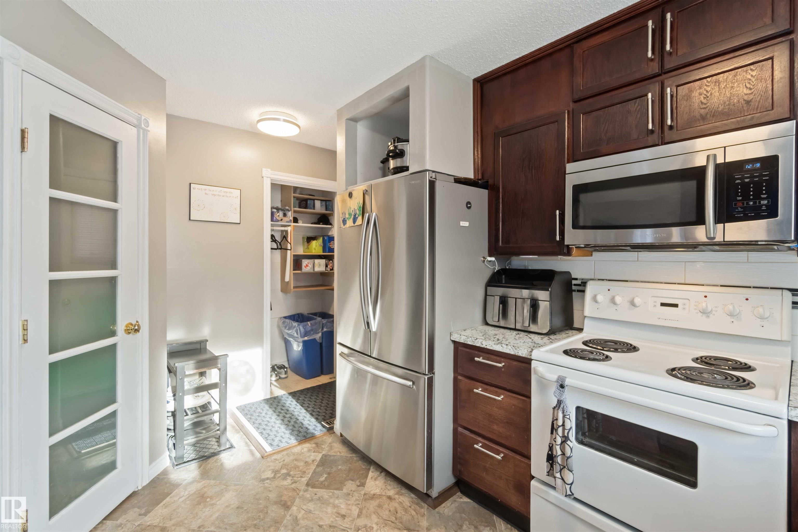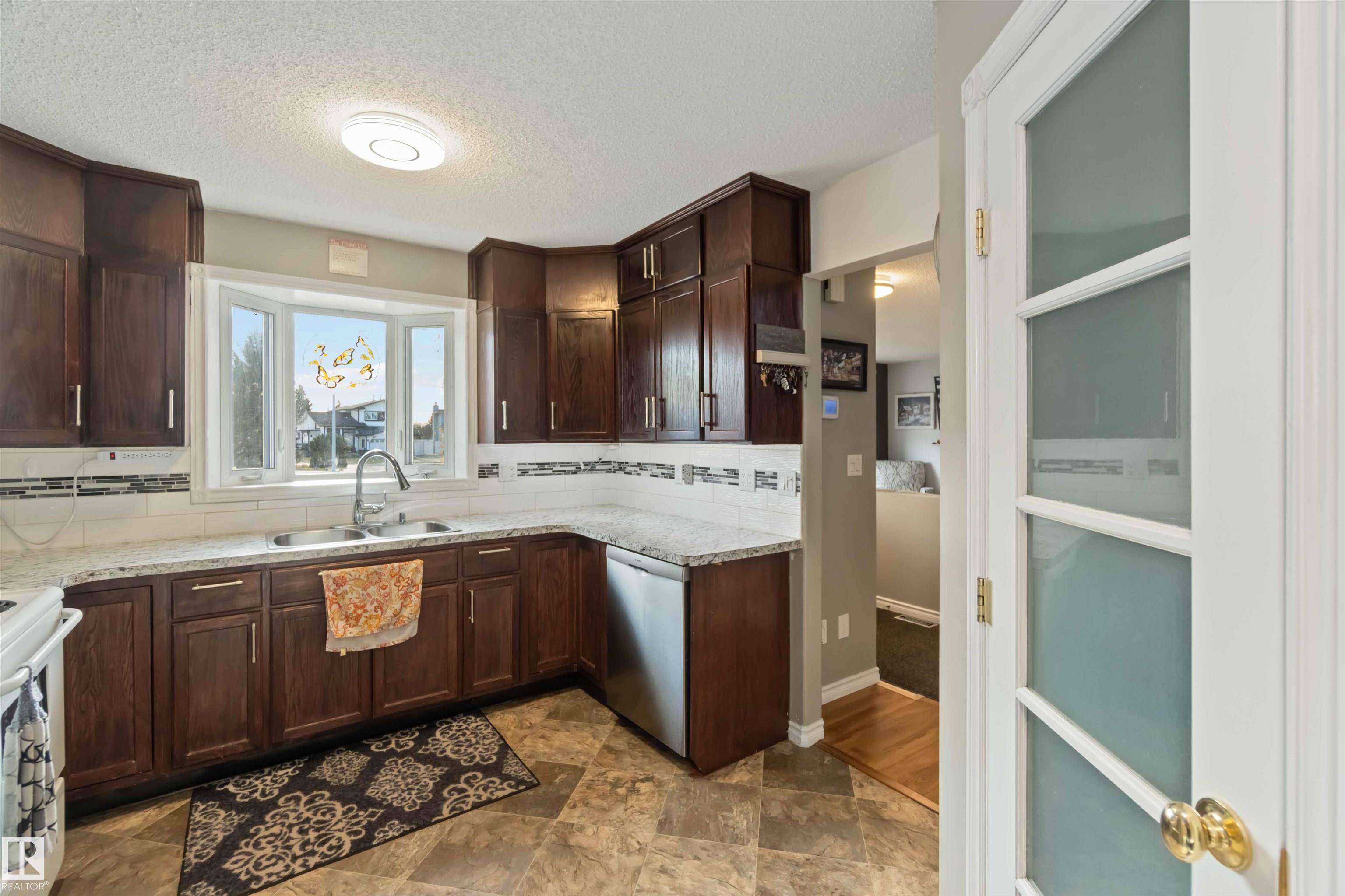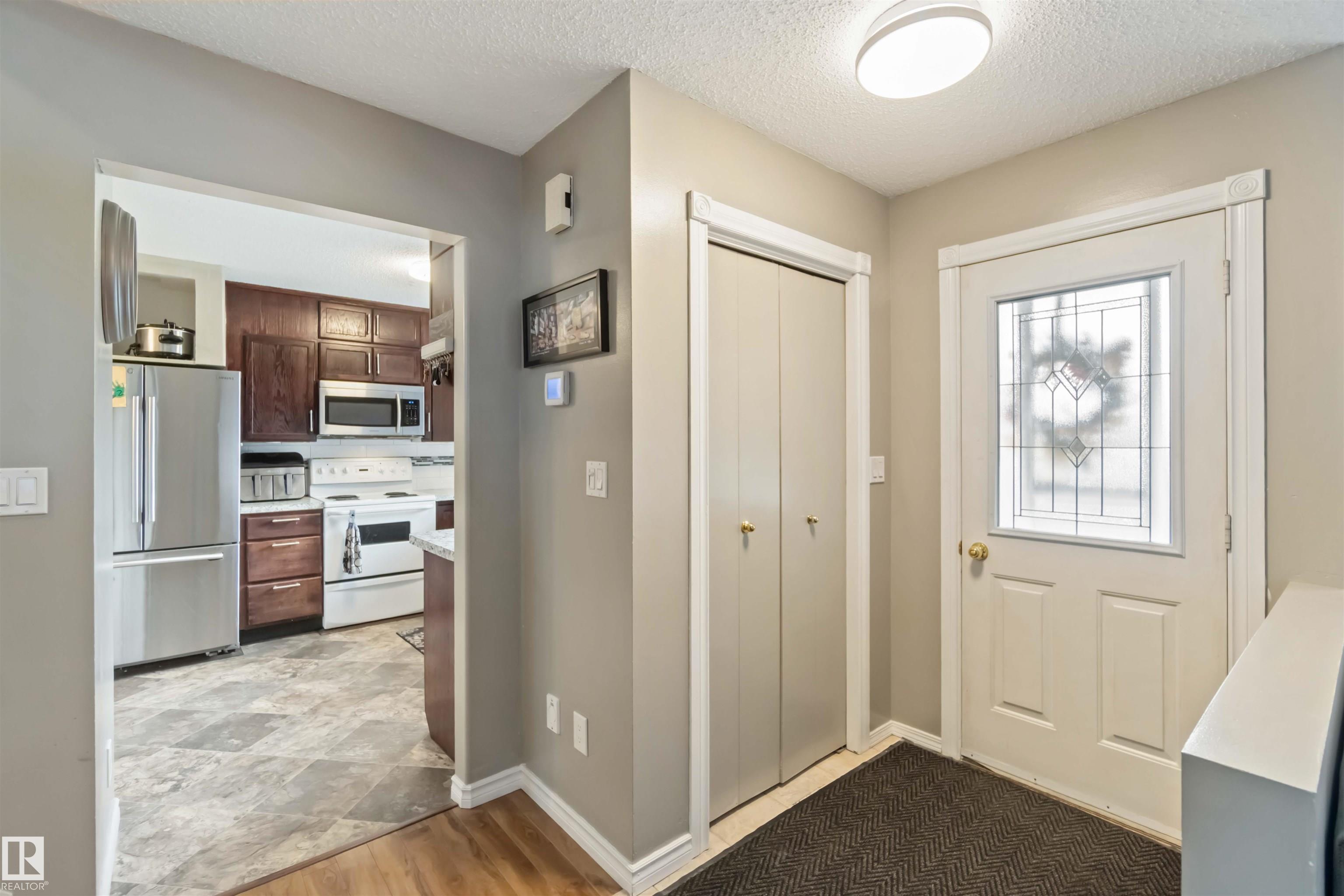 Beautiful 4-level split in La Perle offering 1888sqft of developed living space & a bright, welcoming feel throughout. The main floor features a sunny living room with a large front bay window & a cozy gas fireplace, a spacious dining area & a functional kitchen complete with a walk-in pantry. Upstairs you'll find the primary, an additional comfortable bedroom & a clean, well-kept 4pc bath. The lower level offers a 3rd bedroom, a family room perfect for movie nights & an additional 3pc bath. The basement adds a generous recreation room plus ample storage for seasonal items & hobbies. Outside, enjoy a large fenced yard with a rolling gate, a double detached heated garage & direct access to the green space behind--ideal for pets & kids. Located in a quiet, safe neighbourhood & just steps from shopping, transit, schools & everyday amenities. Updated with laminate & vinyl plank flooring, newer shingles, HWT, and triple pane windows, this home is move-in ready with room to grow. All this home needs is YOU!