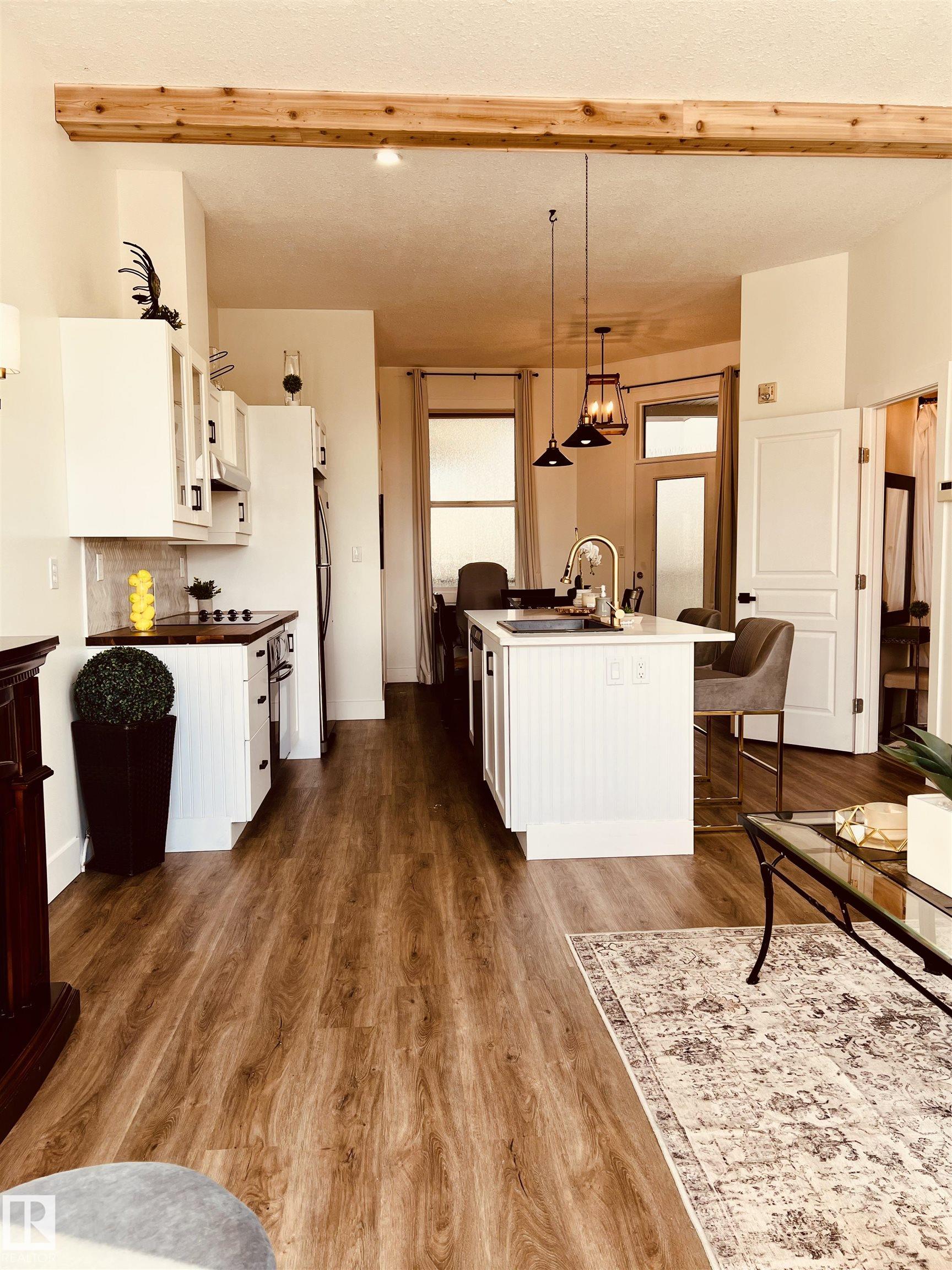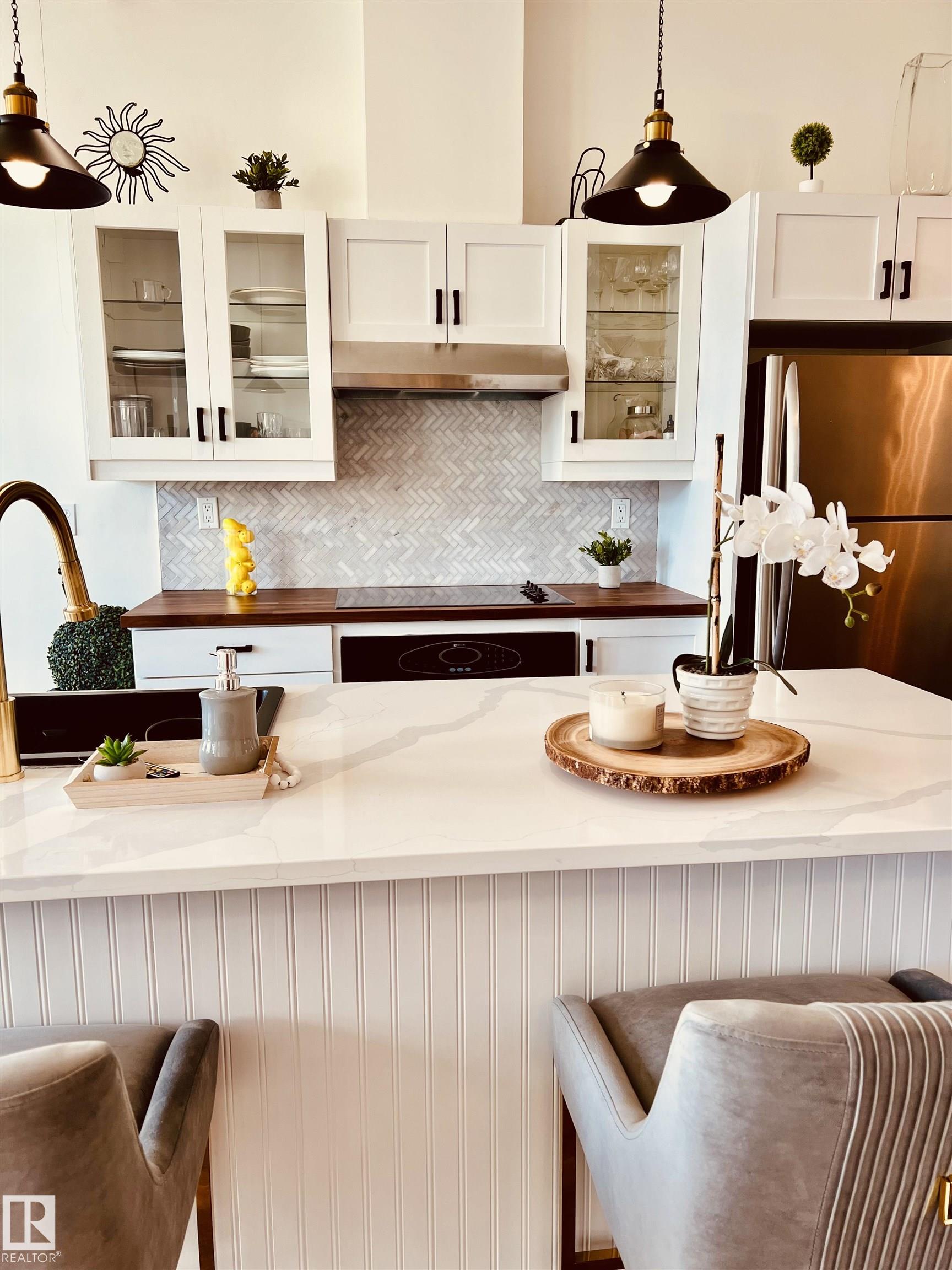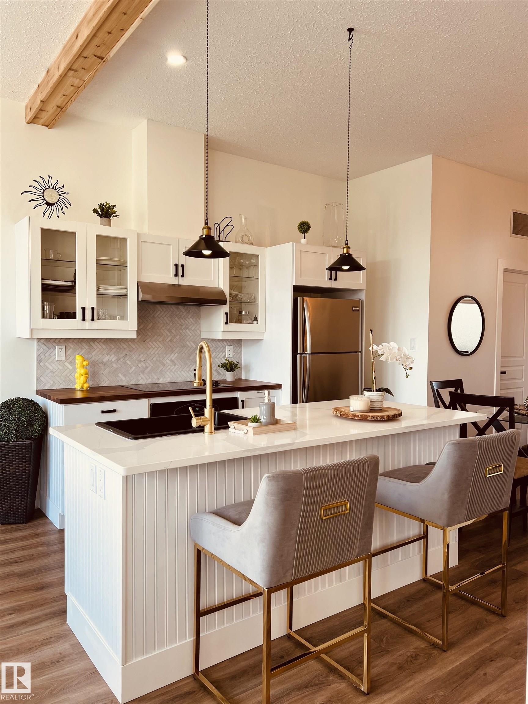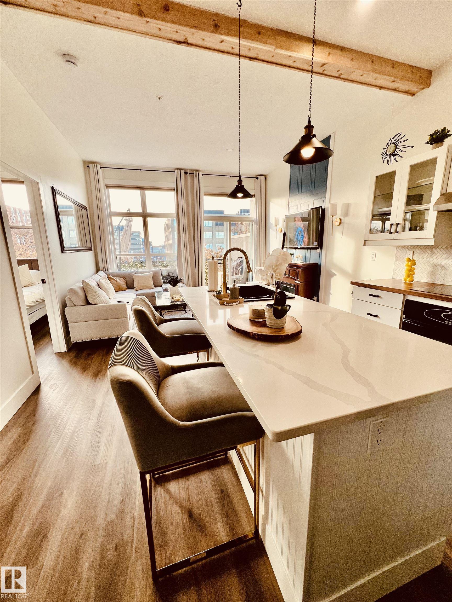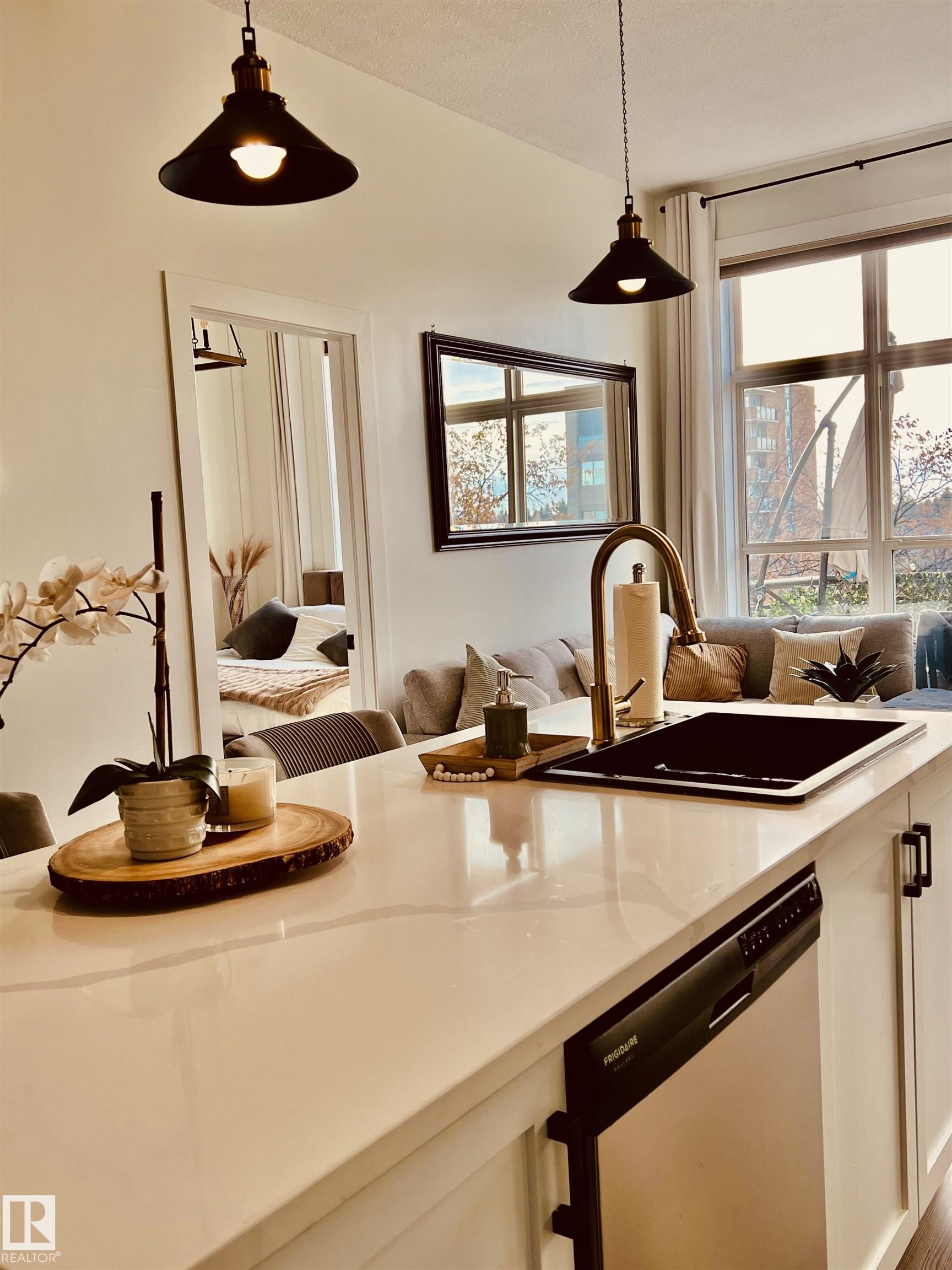 Welcome to Glenora Gates in Westmount. This top-floor forth floor 1 bedroom condo features over 20,000 in renovations and blends modern farmhouse design with city living. Enjoy new luxury vinyl plank flooring ,fresh paint ,baseboards, trim ,and all new lighting. The kitchen includes quartz counters, a shiplap island, herringbone backsplash , and new cabinetry. The bathroom offers floor to ceiling tile and a modern vanity with a walk-through from bathroom to walk-in closet to bedroom .In -suite laundry underground parking, and a spacious balcony complete this pet-friendly home steps from Oliver Square and the Brewery District.