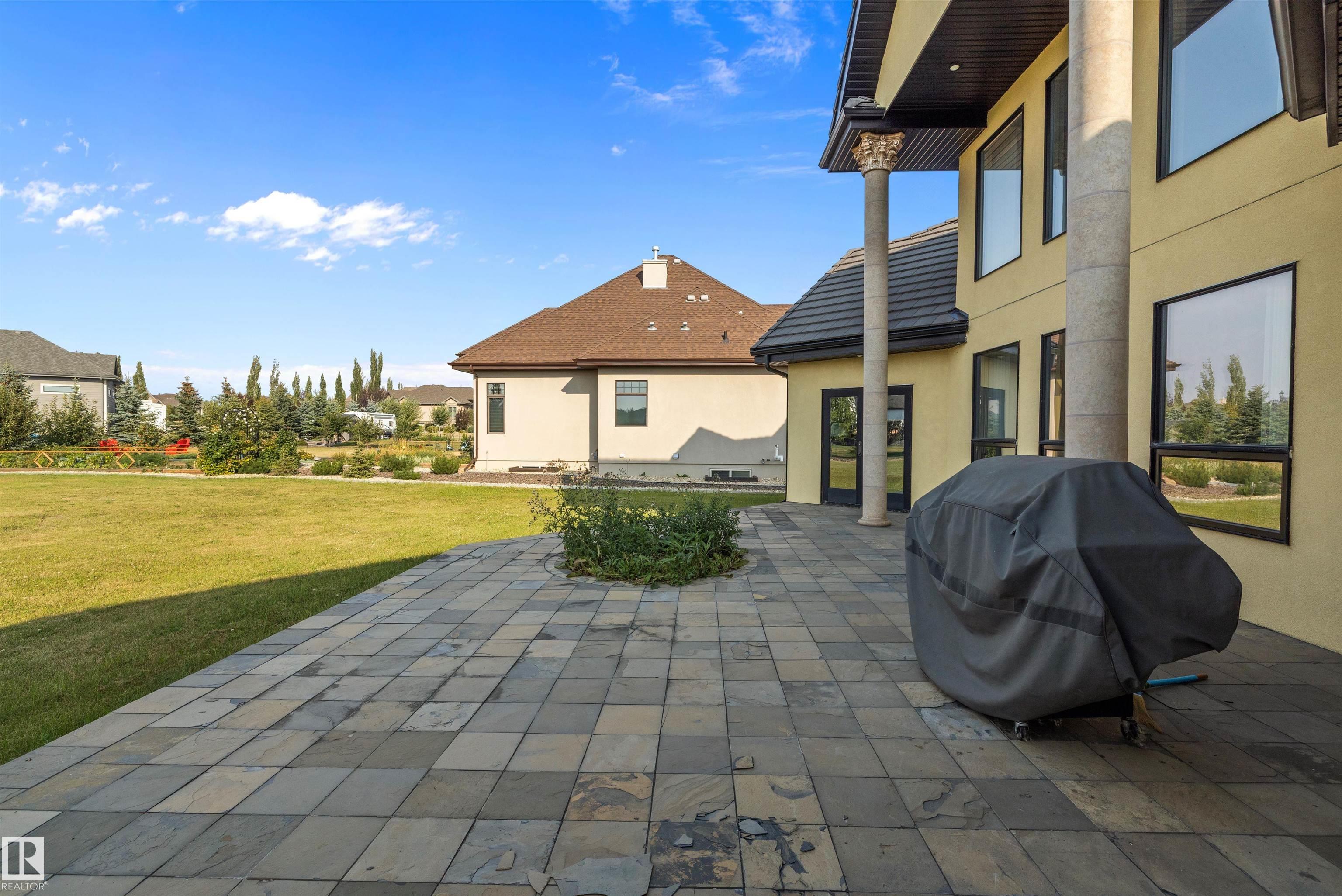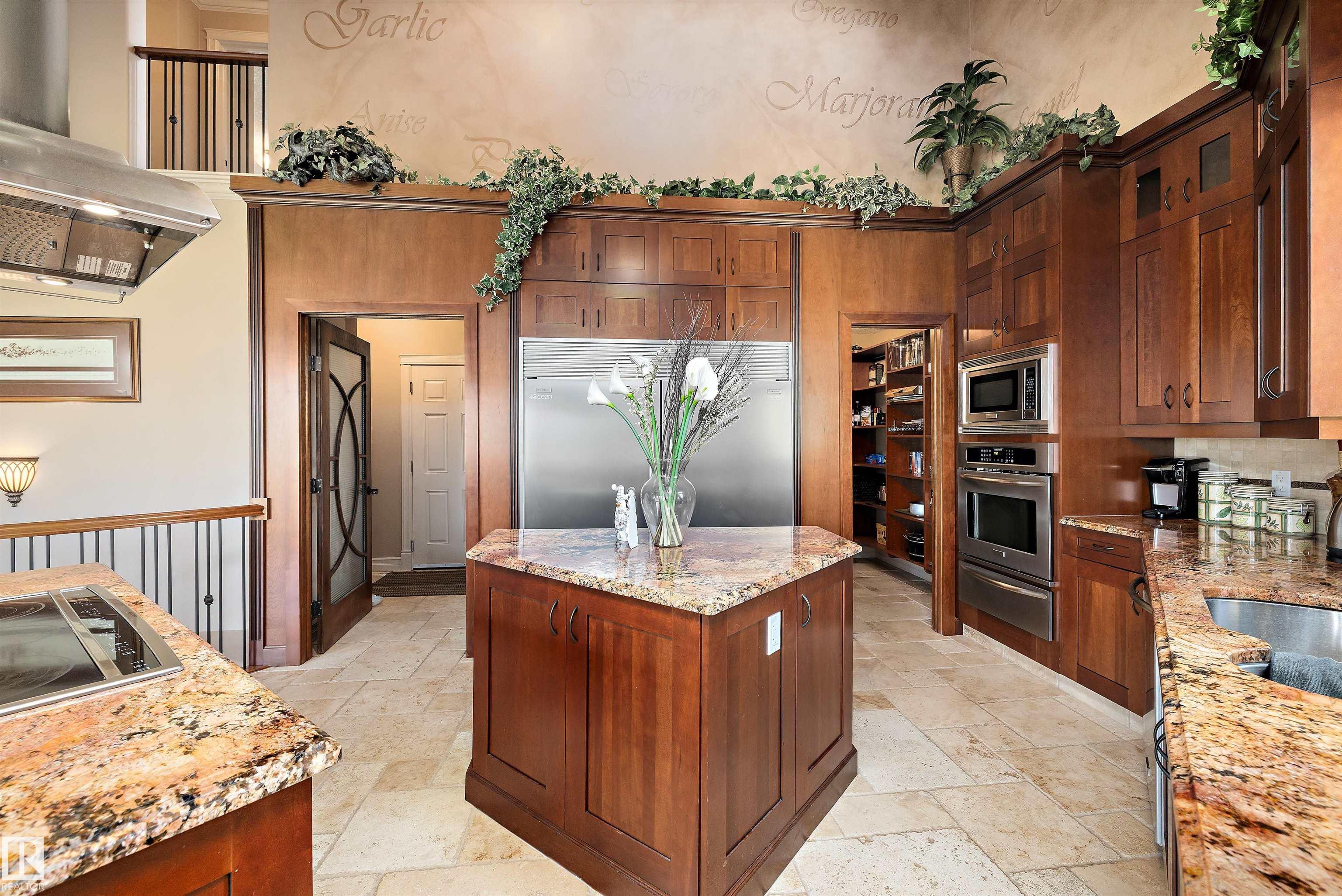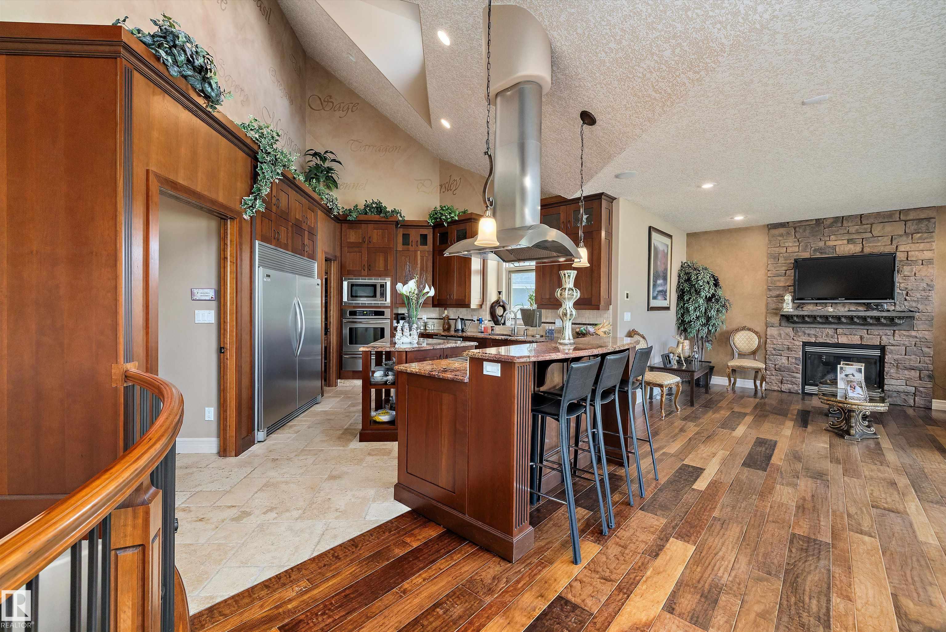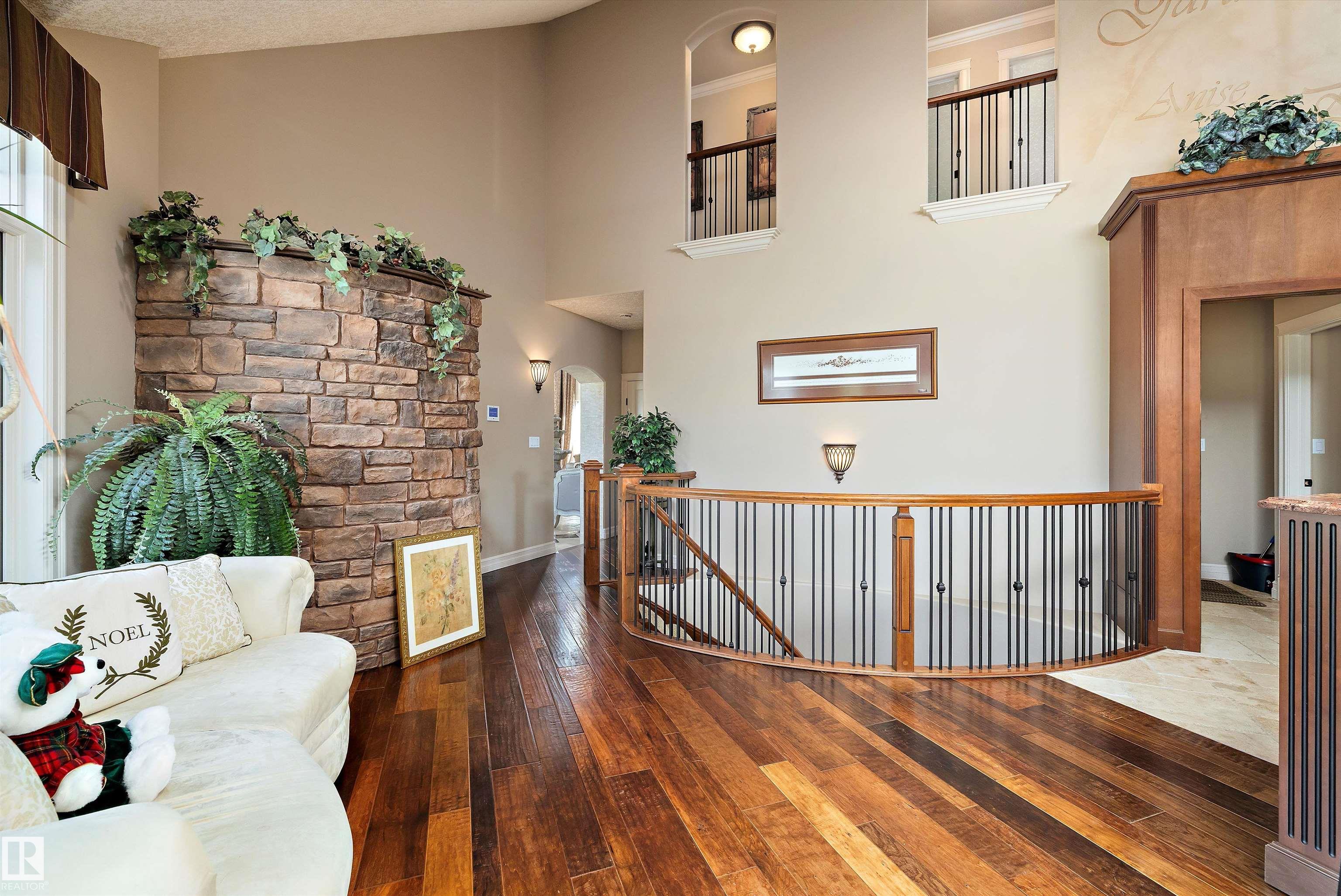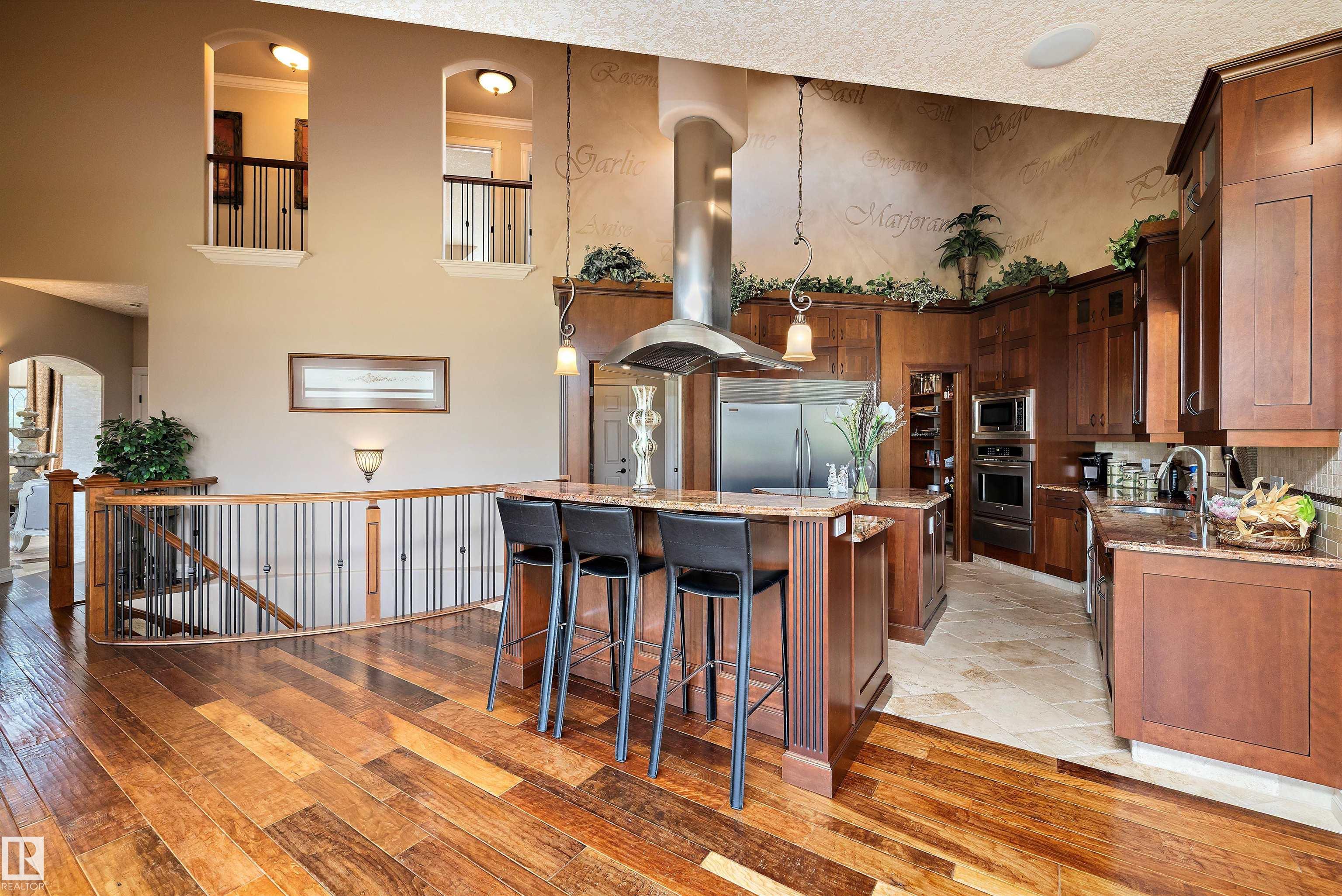 This could be the home you have been waiting for minutes from Edmonton & St. Albert. This 3687 sq. ft. 6 bedroom 2 storey is situated on a half acre fully serviced lot in Tuscany Hills. This home features geo-thermal heating and cooling, concrete roof tile shingles, smooth acrylic stucco exterior, Tumbled travertine floors, fumed cherry hardwood, cherry cabinets with granite counters throughout, gourmet vaulted kitchen with dual islands and 66" wide fridge/freeze. The primary bedroom has an ensuite with round jetted tub and Kohler digital shower system. The curved cherrywood staircase with marble inlays takes you upstairs to 3 additional bedroom two with their own ensuites. The downstairs features a theater room, large rec room with bar and fireplace, plenty of storage and utility room. Park your vehicles in the triple attached garage. This home has too many features to mention but you won't be disappointed.