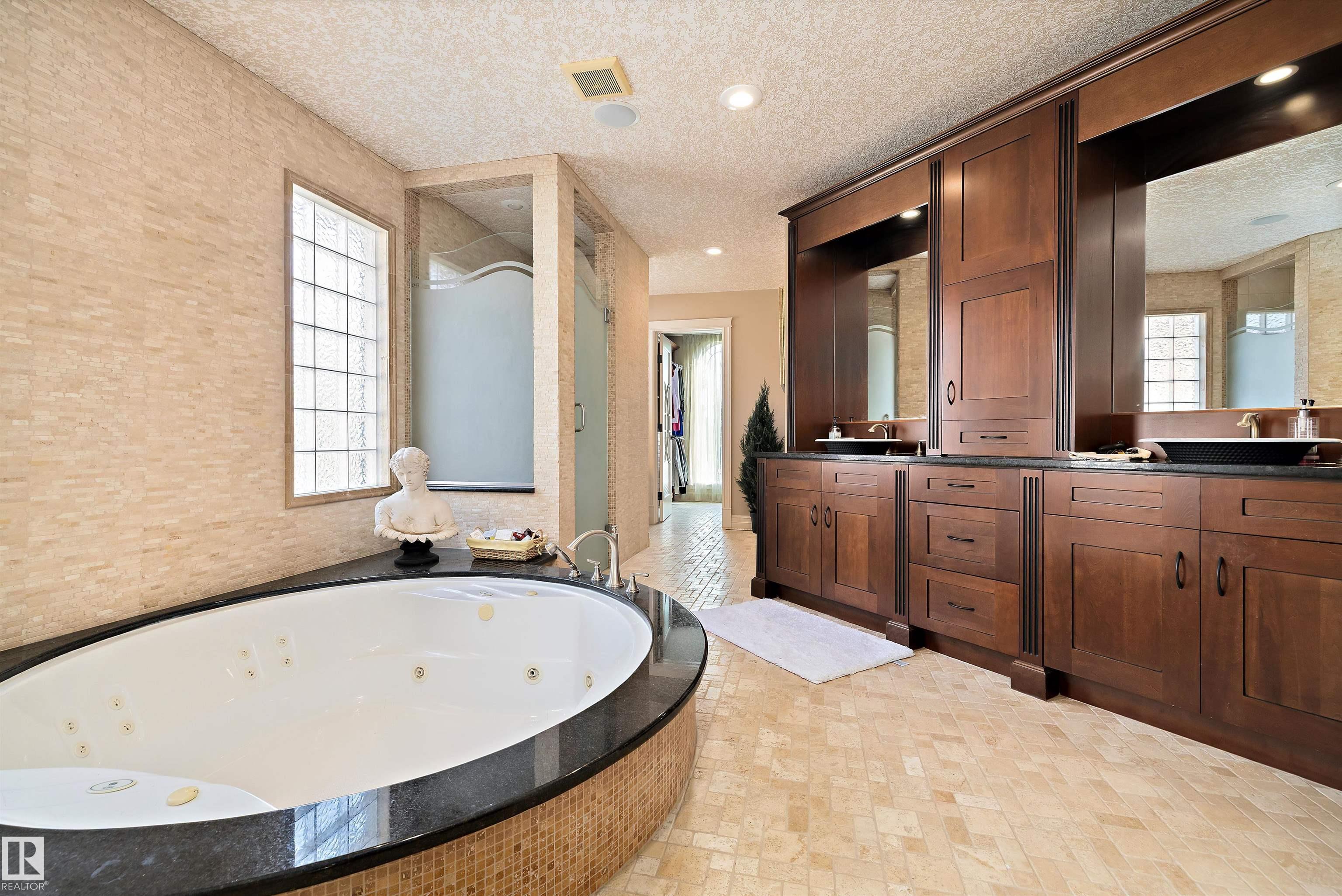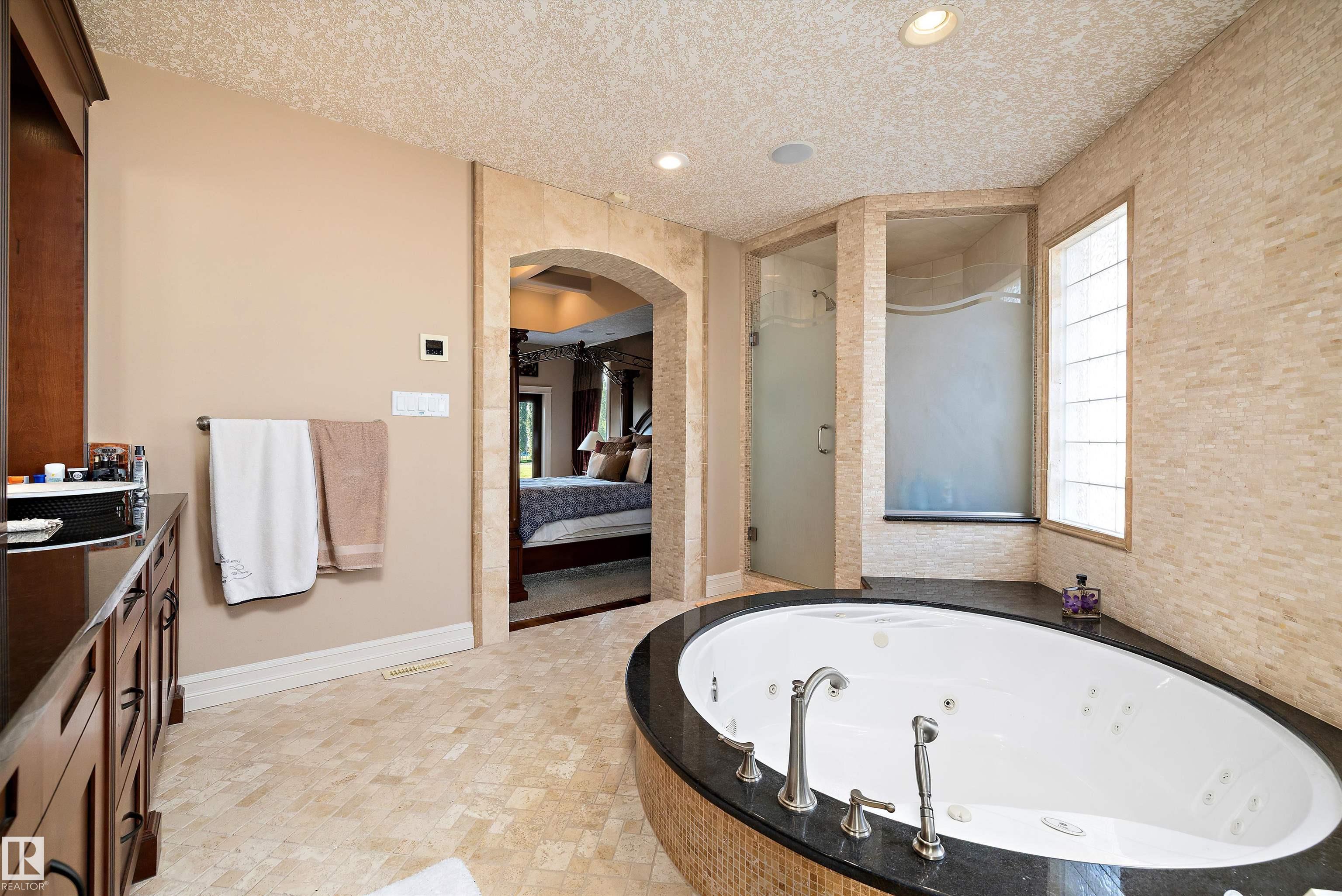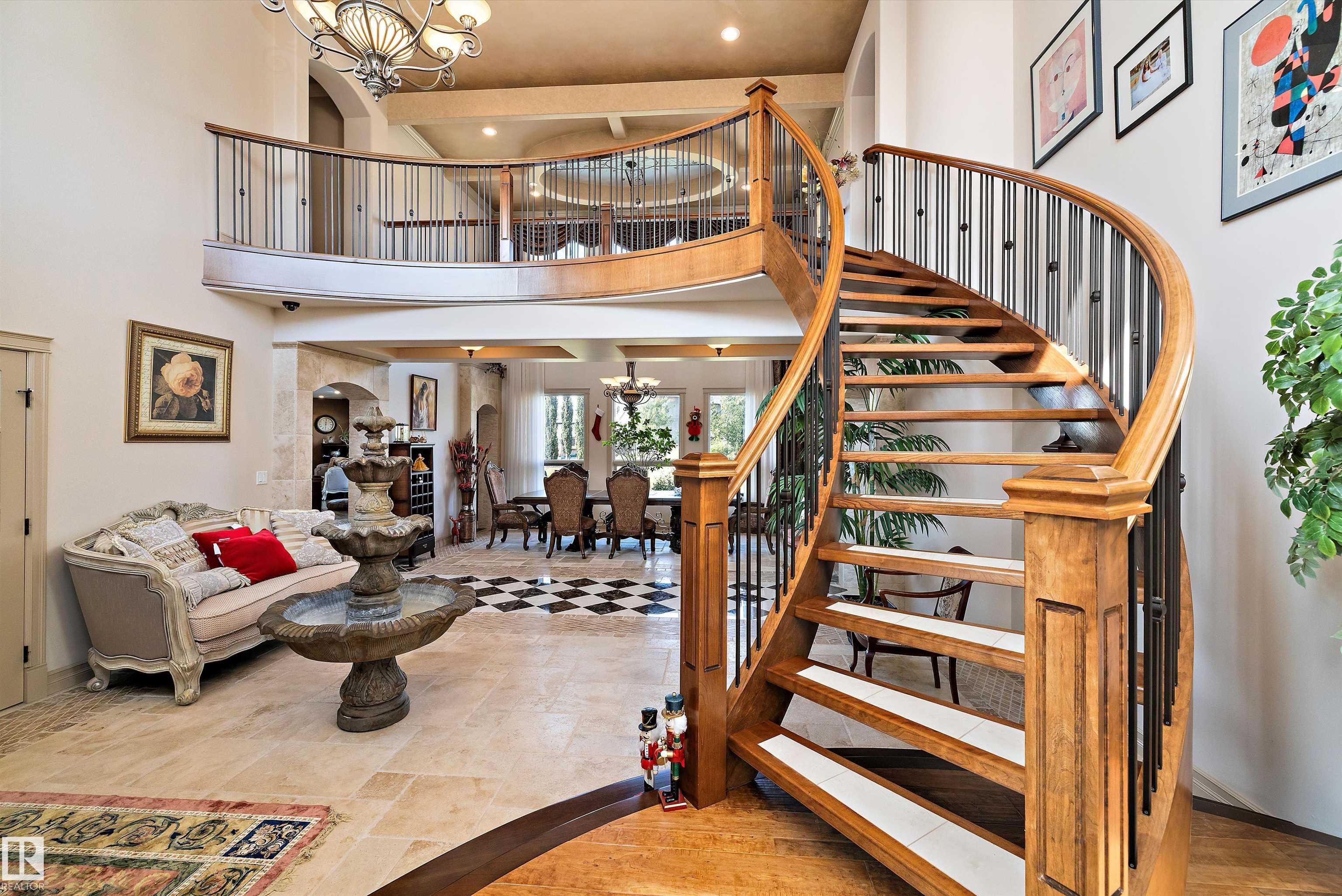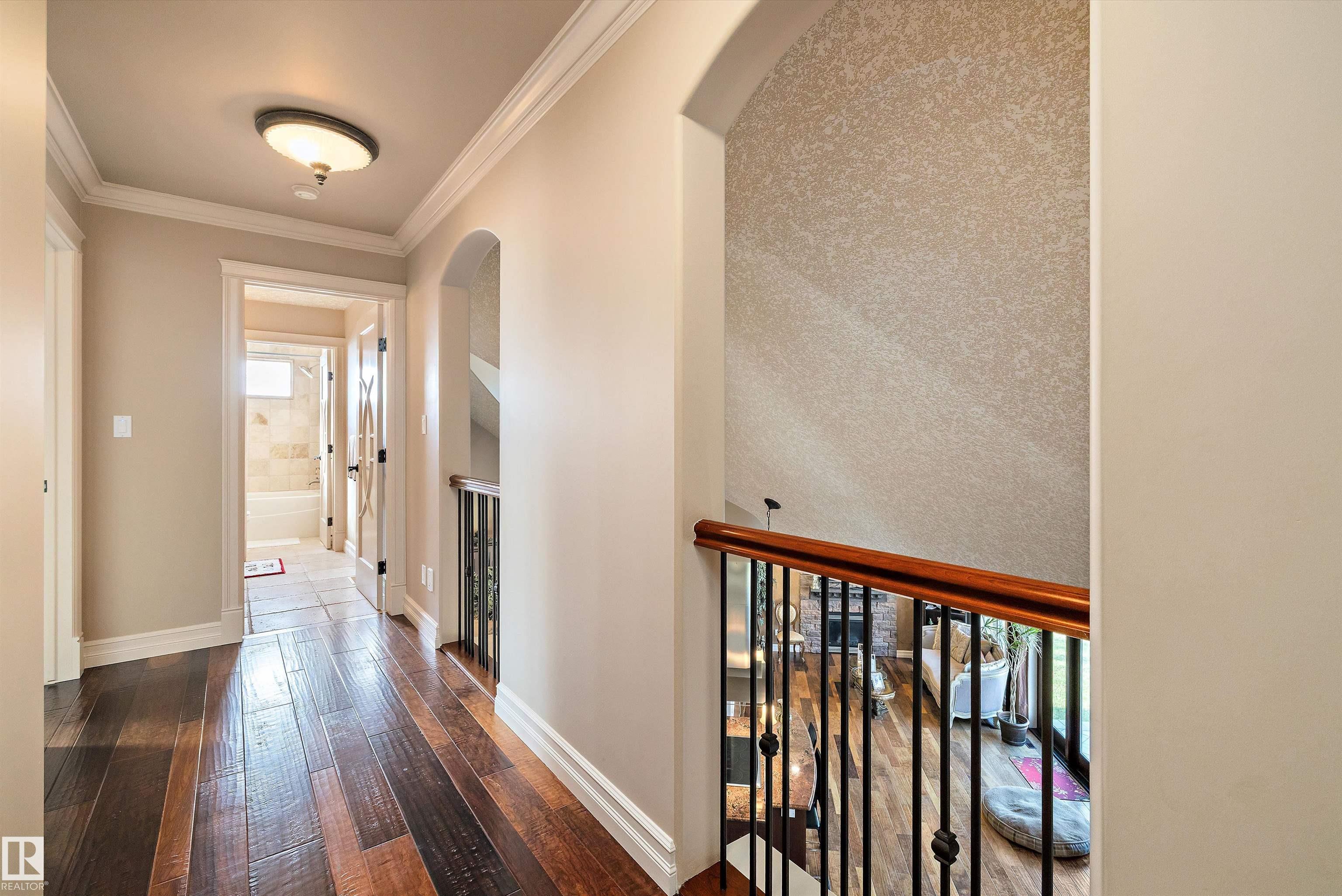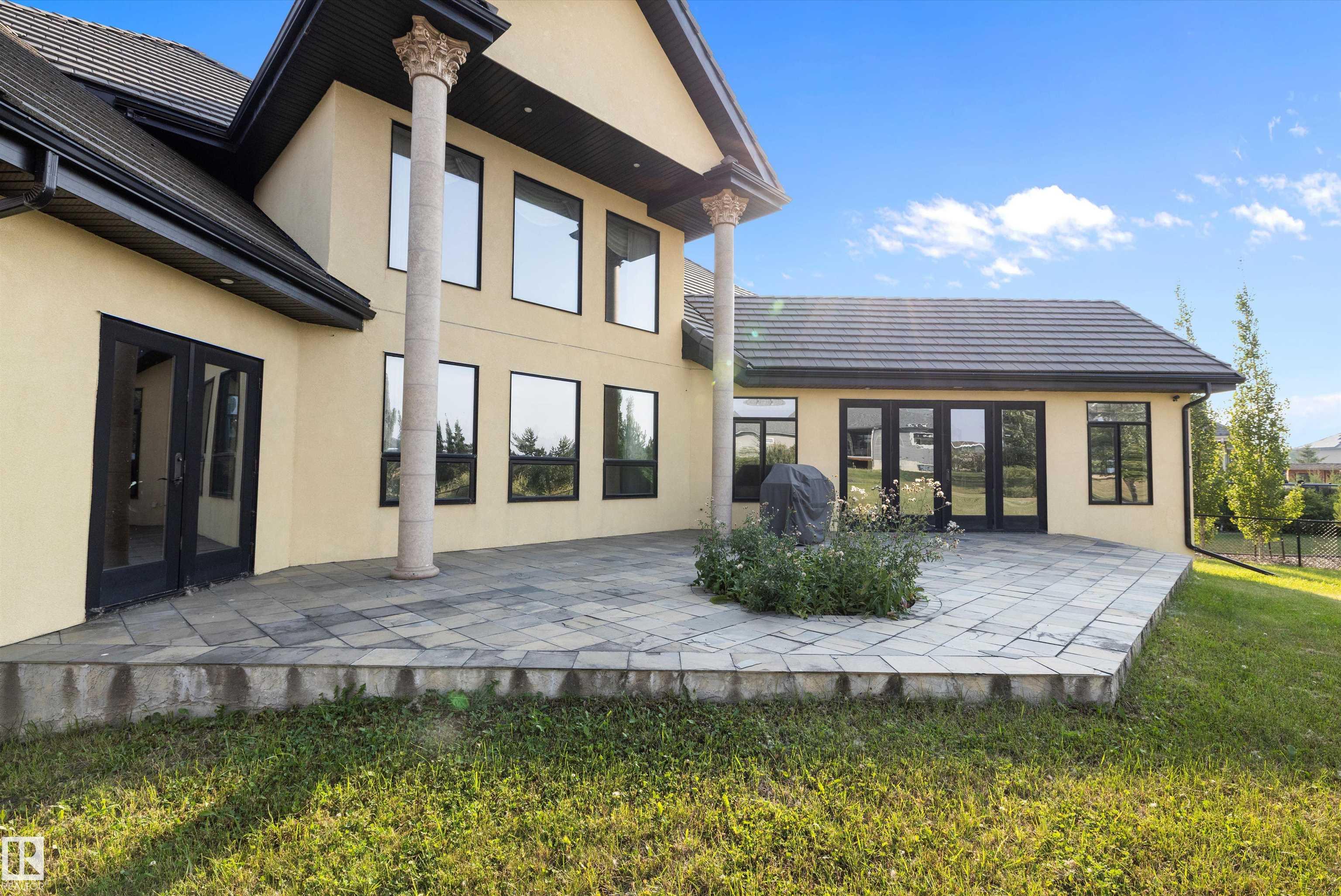 This could be the home you have been waiting for minutes from Edmonton & St. Albert. This 3687 sq. ft. 6 bedroom 2 storey is situated on a half acre fully serviced lot in Tuscany Hills. This home features geo-thermal heating and cooling, concrete roof tile shingles, smooth acrylic stucco exterior, Tumbled travertine floors, fumed cherry hardwood, cherry cabinets with granite counters throughout, gourmet vaulted kitchen with dual islands and 66" wide fridge/freeze. The primary bedroom has an ensuite with round jetted tub and Kohler digital shower system. The curved cherrywood staircase with marble inlays takes you upstairs to 3 additional bedroom two with their own ensuites. The downstairs features a theater room, large rec room with bar and fireplace, plenty of storage and utility room. Park your vehicles in the triple attached garage. This home has too many features to mention but you won't be disappointed.