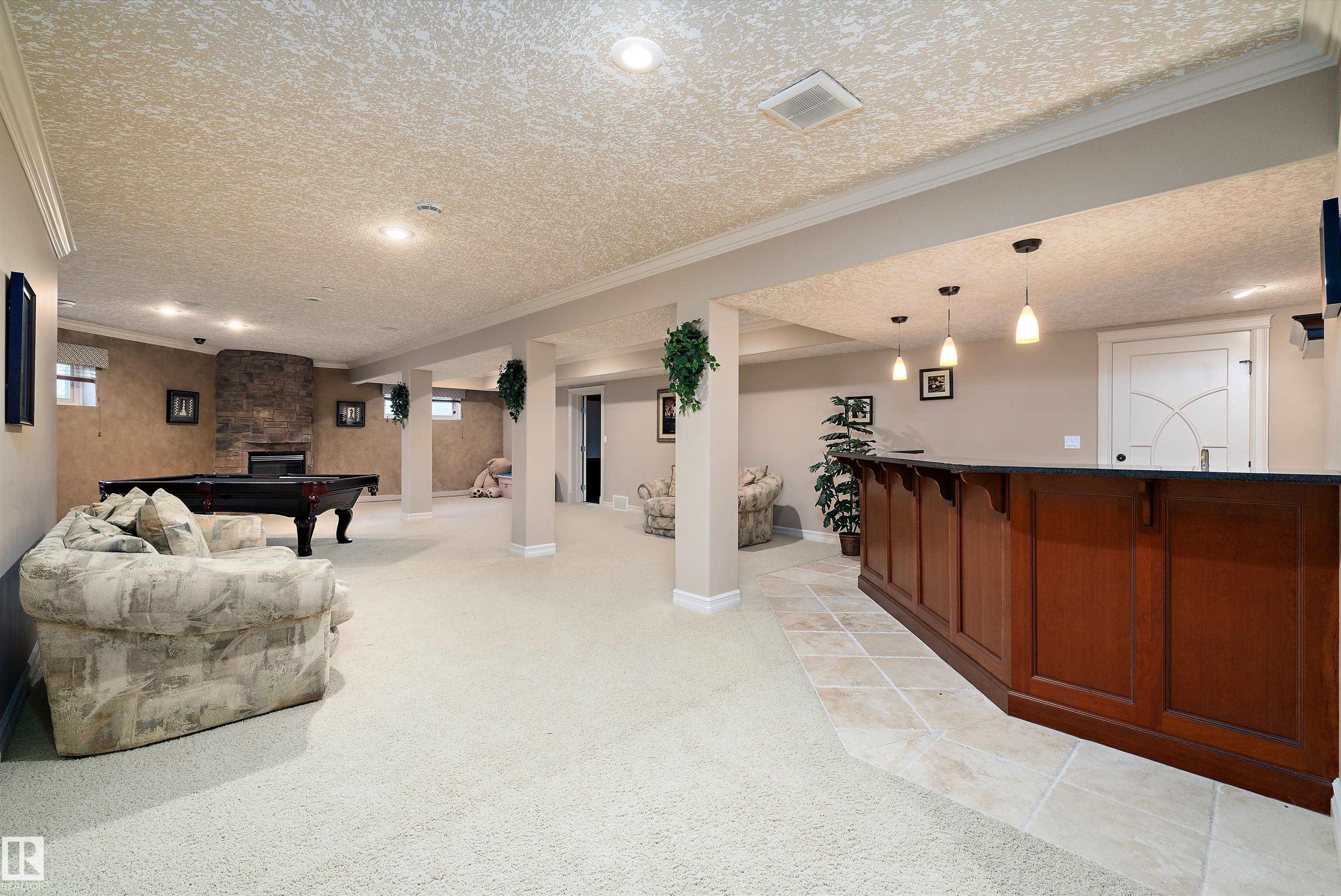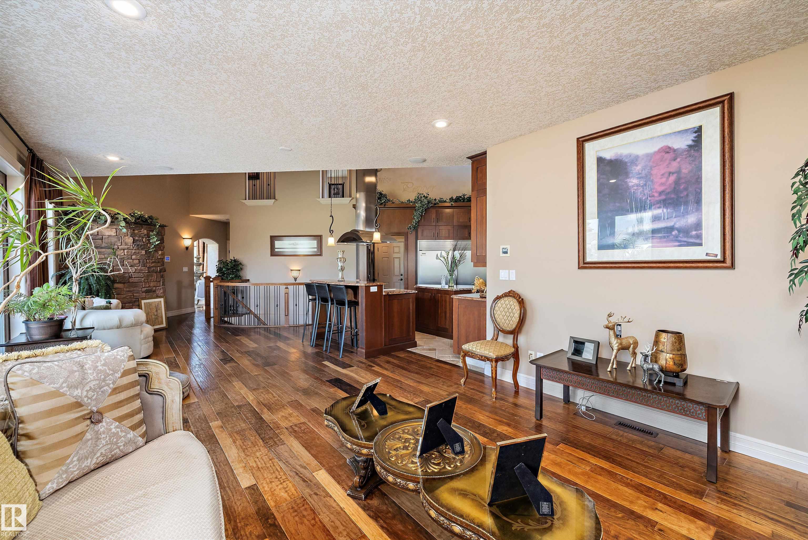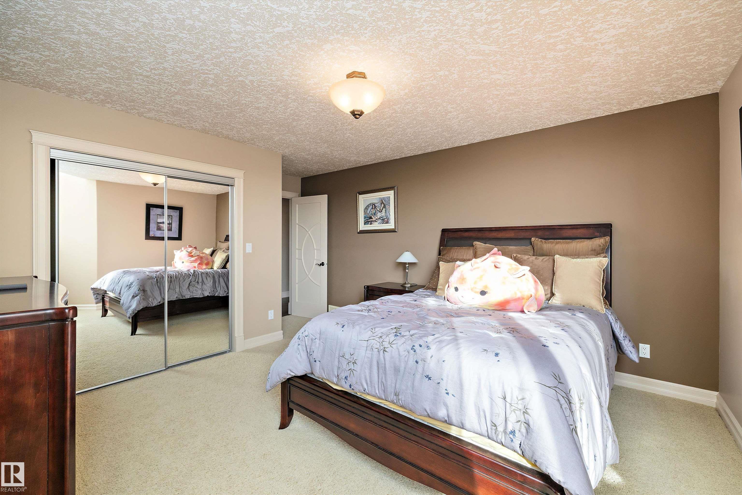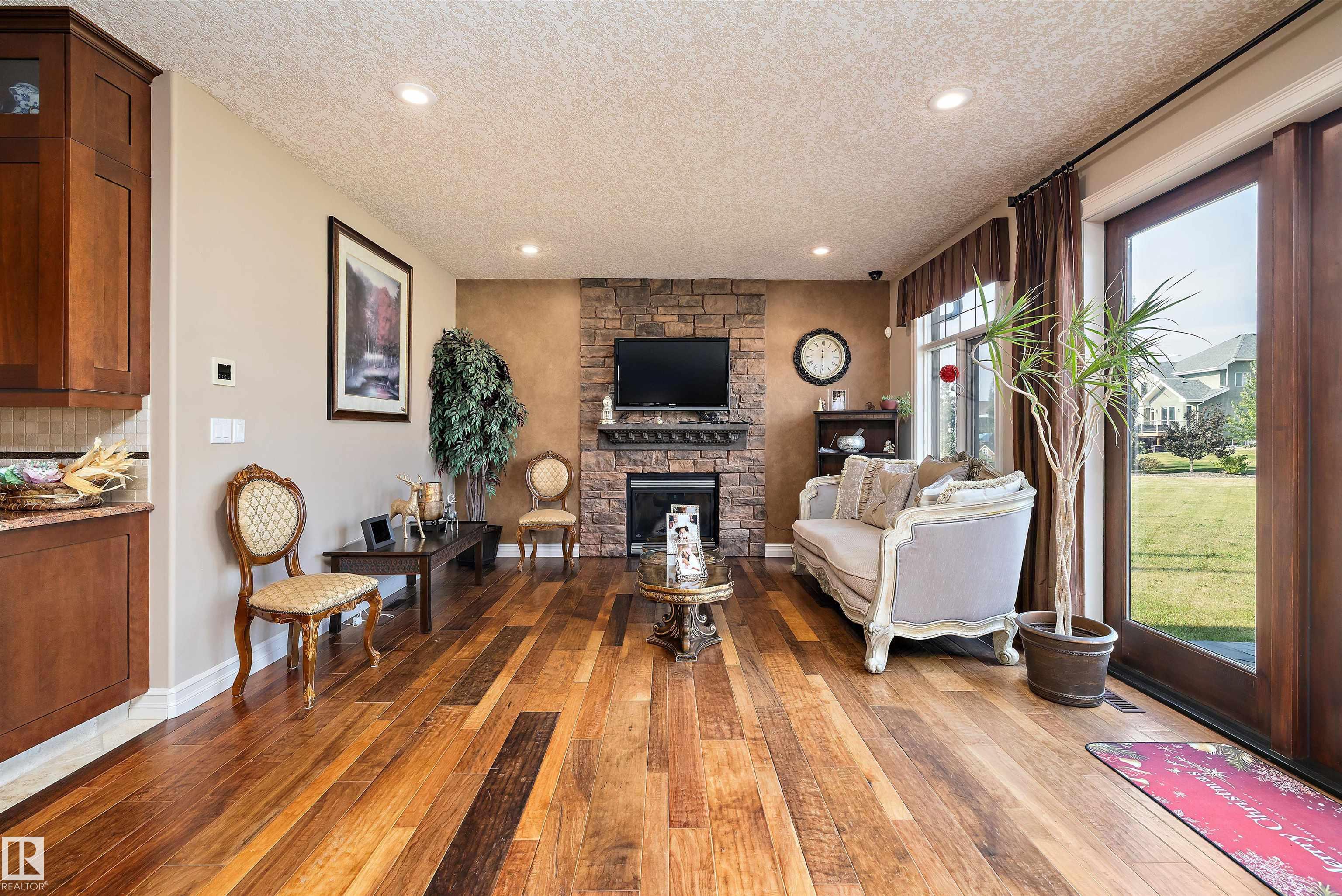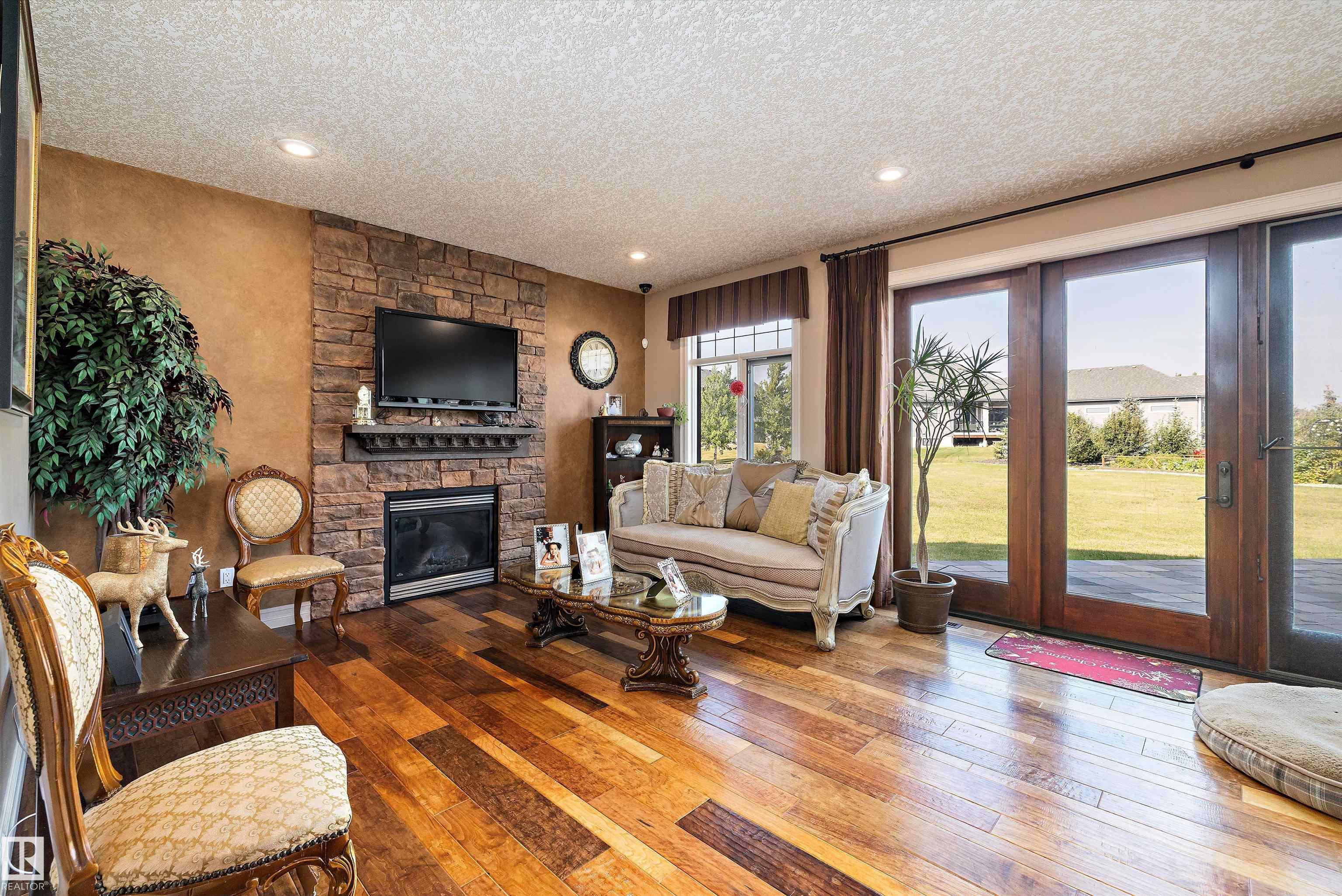 This could be the home you have been waiting for minutes from Edmonton & St. Albert. This 3687 sq. ft. 6 bedroom 2 storey is situated on a half acre fully serviced lot in Tuscany Hills. This home features geo-thermal heating and cooling, concrete roof tile shingles, smooth acrylic stucco exterior, Tumbled travertine floors, fumed cherry hardwood, cherry cabinets with granite counters throughout, gourmet vaulted kitchen with dual islands and 66" wide fridge/freeze. The primary bedroom has an ensuite with round jetted tub and Kohler digital shower system. The curved cherrywood staircase with marble inlays takes you upstairs to 3 additional bedroom two with their own ensuites. The downstairs features a theater room, large rec room with bar and fireplace, plenty of storage and utility room. Park your vehicles in the triple attached garage. This home has too many features to mention but you won't be disappointed.